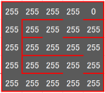 ④0の所を見つけたら、その周囲4マスのうち、壁がなく歩数が255の所を1に変えます。