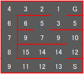 そこで比較的簡単に実装するために、直進の多い経路が最短となるよう歩数マップの作り方を変えます。