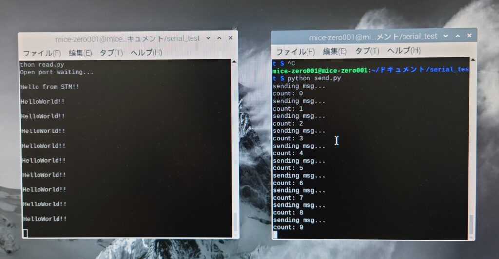 まずは、ラズベリーパイZeroからNucleoにメッセージを送ります。数字のカウントアップと数審の送信を行います。
