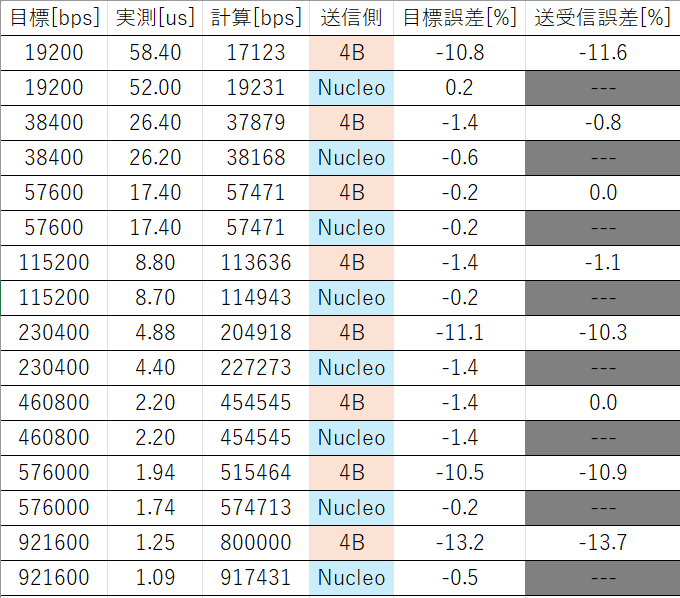 目標誤差が完全に0になることはなかったが、送受信誤差が0になるボーレートはいくつかありました。送受信時の文字化けを無くすためには、送受信誤差が小さいほうがいいので、57600と460800が有力候補です。
