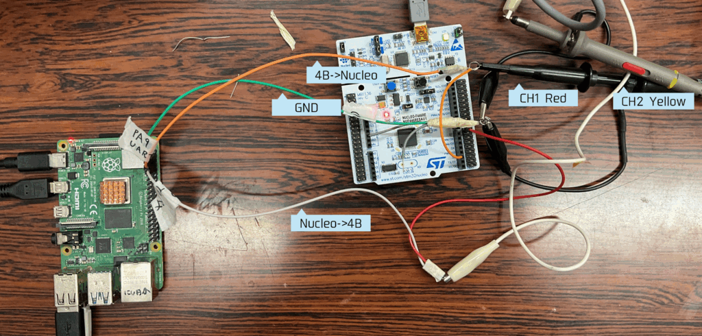 ラズベリーパイ4BとNucleoをジャンプワイヤで繋ぎ、その間にオシロスコープのプローブを繋いだ。