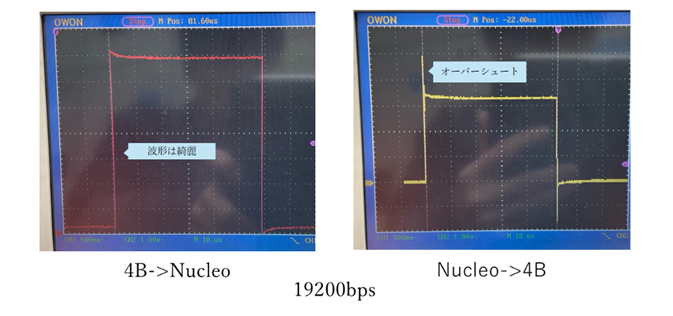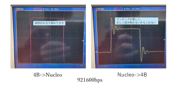 Nucleoが生成する信号には必ずオーバーシュートが含まれ、ラズベリーパイ4Bが生成する信号は若干横幅が大きくなりました。また、ボーレートを大きくしていくと、どんどん波形が歪んでゆき、最終的にはとても使えない波形になってしまいました。